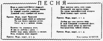 Источник: Бушуев К. Песня // Краснофлотец. 1945. 24 мая. № 122. С. 3. |